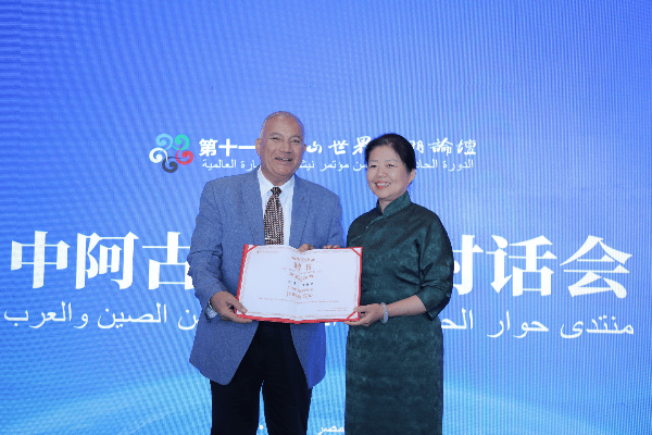 国承彦向埃及苏伊士运河大学孔子学院埃方院长、埃及英国大学语言文学中文系主任哈桑・拉杰布教授,艾资哈尔大学中文系主任、高等翻译学院院长阿齐兹教授颁发尼山世界儒学中心特聘研究员证书,并赠送书籍,为埃中文化交流协会颁发“孔子学堂”牌匾。