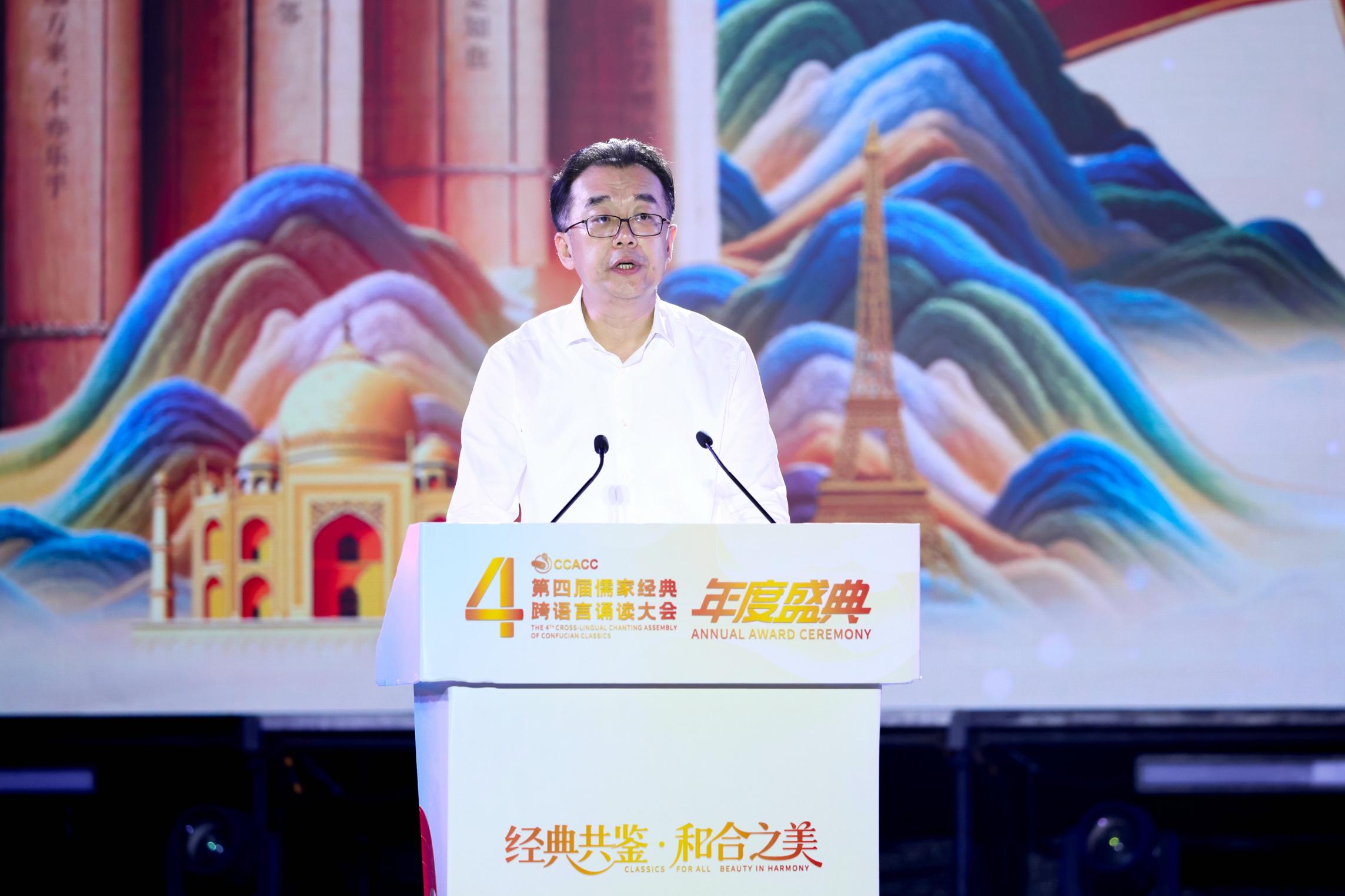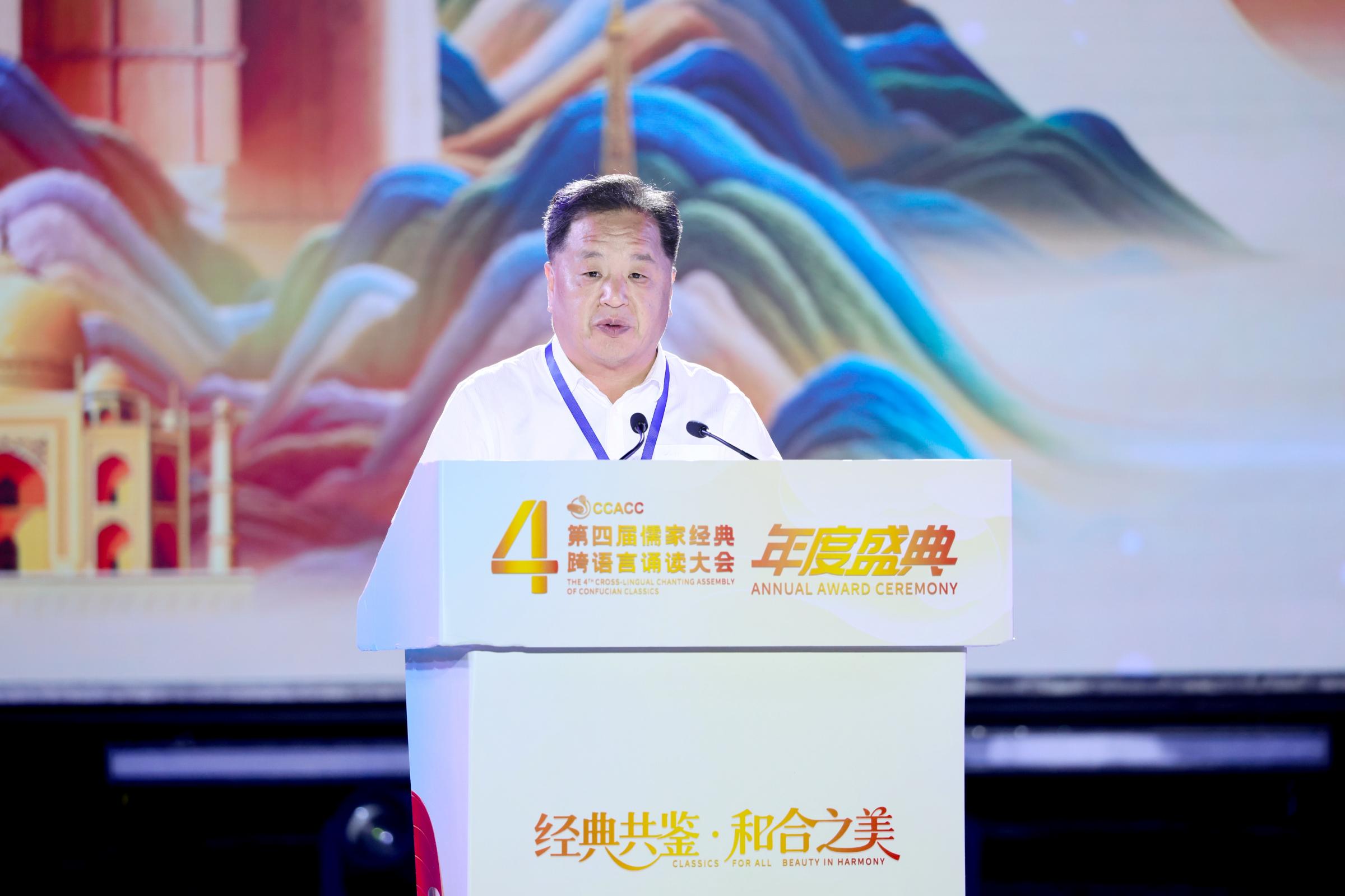 国承彦在讲话中表示,儒家文化作为中华优秀传统文化的重要组成部分,蕴含着“以和为贵”“天下大同”的深刻智慧,与上合组织倡导的“上海精神”高度契合。盛典在青岛举办,既是儒家文化国际传播成果的展示,也是上合组织框架下人文交流的生动实践。本届儒家经典跨语言诵读大会致力于打造国际人文交流品牌,推动中华文化在全球范围内广泛传播,自2024年9月启动以来,吸引了来自70余个国家的5万余名选手热情参与,收到作品2.3万余件,其中来自上合组织成员国、观察员国和对话伙伴国的作品占外国作品数量的45%,儒家经典所蕴含的“仁爱”“中和”“大同”智慧,正以其跨越时空、超越国界的魅力,成为世界文明交流互鉴的“通用语”。站在文明互鉴的新起点上,尼山世界儒学中心和中国孔子基金会将与各方一道,不断开创文明对话新形式,探索文化出海新路径,搭建多元对话新平台,努力构建全球传播新体系,以创新开放的姿态谱写文明对话新篇章,让儒家文化的时代价值在世界舞台绽放异彩,为构建人类命运共同体贡献文化力量。