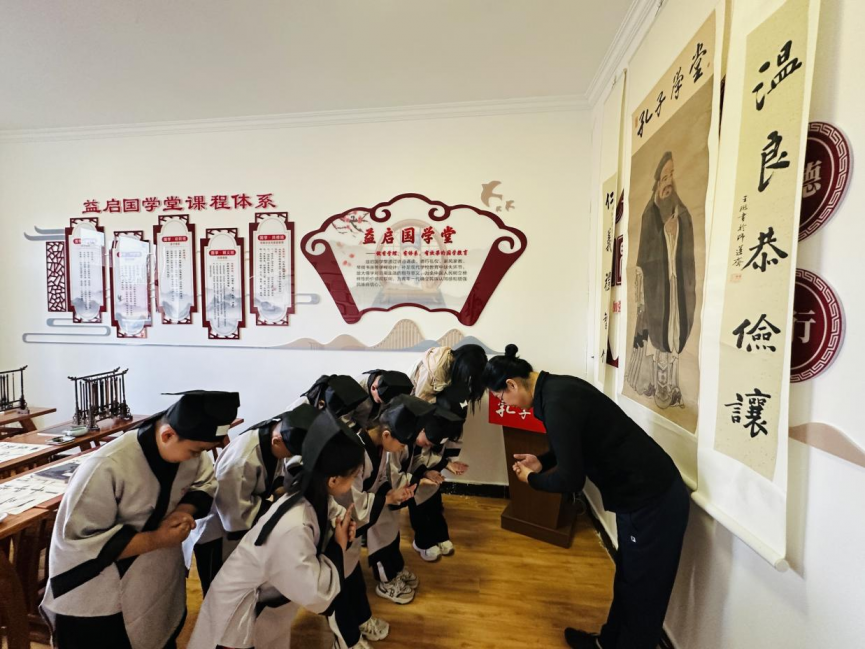 “礼者,天地之序也。” 活动当日,一场庄重的拜孔仪式,成为孩子们与传统文化深度连接的起点。身着宽袍广袖的汉服,孩子们神情肃穆,在孔子学堂老师张艳的悉心引导下,一步步完成拱手、作揖、鞠躬的礼仪动作。举手投足间,不仅是对传统礼仪形式的复刻,更是对“尊师重道”“敬畏文化”传统美德的践行。当孩子们的目光望向孔子像,当恭敬的礼仪落地生根,传统不再是遥远的历史符号,而成为可感、可行的精神滋养。这场仪式,悄然在少年心中种下“敬先贤、传文脉”的种子,让文化自信的根基在启蒙阶段便扎得更深、更牢。