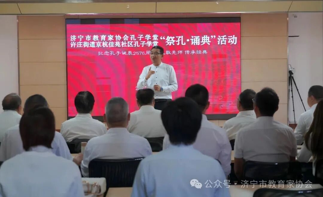 9月25日,值此孔子诞辰2576周年之际,济宁市教育家协会孔子学堂与京杭佳苑社区孔子学堂联合举办“祭孔·诵典”活动。市教育家协会会长刘宝之、京杭佳苑社区党委副书记闫峰出席活动,市教育家协会孔子学堂、京杭佳苑社区孔子学堂负责人、专家及志愿者等近30人参加了活动。