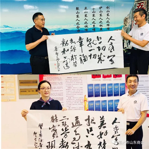 酷爱书法的贺书记向嘉兴山东商会和孔子学堂赠送自己书写的墨宝