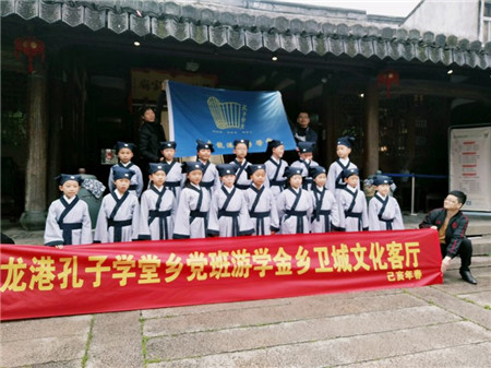 “暮春者,春服既成,冠者五六人,童子六七人,浴乎沂,风乎舞雩,咏而归。”游学历来是学习传统文化的有效途径,正所谓“读万卷书行万里路”,至圣先师亦如是。近日,浙江龙港孔子学堂组织乡党班学员游学金乡卫城文化客厅。当日上午,乡党班学员及家长一行40余人在学堂孔爱月老师带领下驱车来到古城金乡。小学员们统一身着学堂堂服,高举孔子学堂堂旗,由来爽门进入古城,沿着西门大街,踏着青砖铺成的地面,经朝北张家大院来到沈泰丰卫城文化客厅。