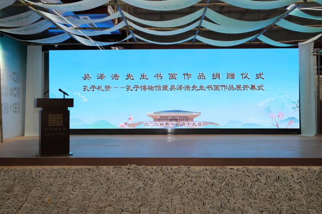 11月19日,“孔子礼赞——孔子博物馆藏吴泽浩先生书画作品展”开幕式系列活动在孔子博物馆举办,活动包括“孔子礼赞——孔子博物馆藏吴泽浩先生书画作品展”开幕式、捐赠仪式和艺术座谈会三部分。吴泽浩先生出生于广东潮汕,少承家学,师承关山月、黎雄才、杨之光等艺术大师,深得岭南画派精髓,后扎根齐鲁大地,涵养儒学气韵。吴泽浩先生将自己创作的108幅《孔子礼赞》系列书画作品捐赠给孔子博物馆,主动为中华优秀传统文化创新与传承贡献心力。这些作品不仅丰富了孔子博物馆现代书画藏品内容,更体现出吴先生博大胸怀和对孔子无限敬仰之情。开幕仪式上,孔子博物馆向吴泽浩先生颁发了捐赠证书并赠送《孔子礼赞——孔子博物馆藏吴泽浩先生书画作品展》图录。
