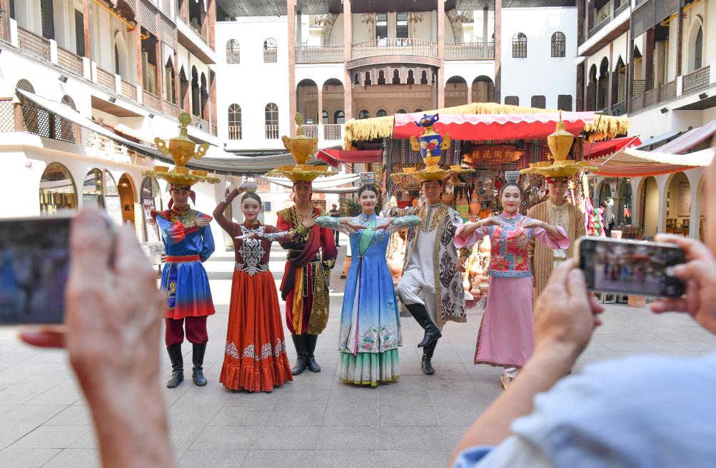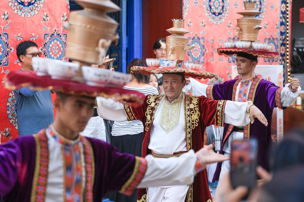 新疆ウイグル自治区クチャ市の観光街「亀茲小巷」でサマワールダンスを披露する人々。(7月22日撮影、クチャ=新華社記者/王菲)