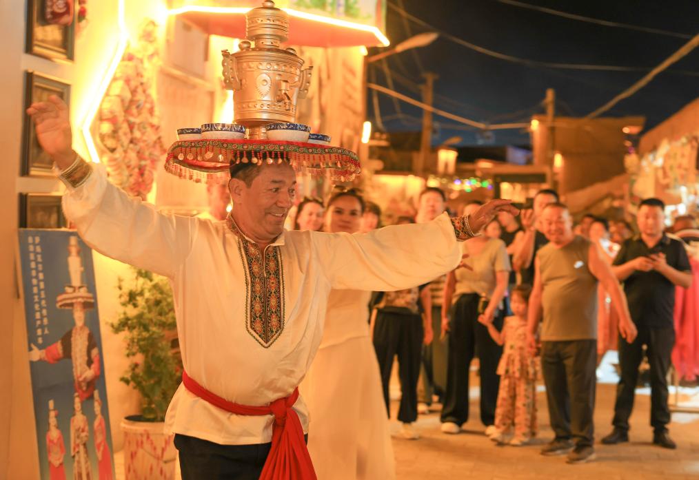 新疆ウイグル自治区クチャ市の観光街「亀茲小巷」でサマワールダンスを披露する民間舞踊家。(8月4日撮影、クチャ=新華社記者/王菲)