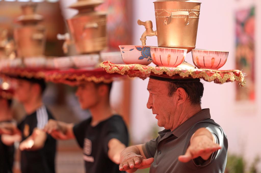 9日、新疆ウイグル自治区ウルムチ市でサマワールダンスを披露する人々。(ウルムチ=新華社記者/王菲)