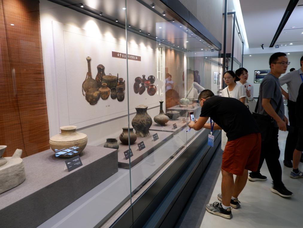 湖北省孝感市の雲夢県博物館で文化財を見学する来館者。(8月26日撮影、孝感=新華社記者/陳雨寧)