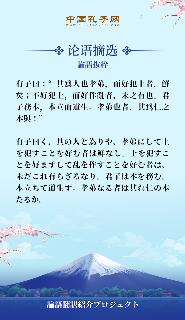 有子曰く,其の人と為りや、孝弟にして上を犯すことを好む者は鮮なし。上を犯すことを好まずして乱を作すことを好む者は、未だこれ有らざるなり。君子は本を務む。本立ちて道生ず。孝弟なる者は其れ仁の本たるか。